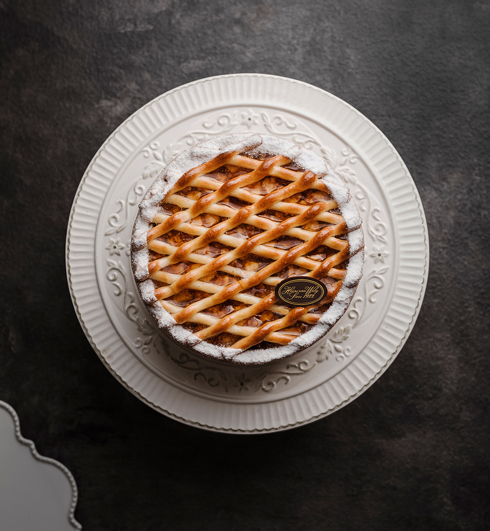 A Dutch apple pie consisting of a layer of almond paste, almond batter, an apple filling with candied orange, apricot, walnut, raisins and cinnamon, on a rich dough base and decorated with a grid of macaroon paste.