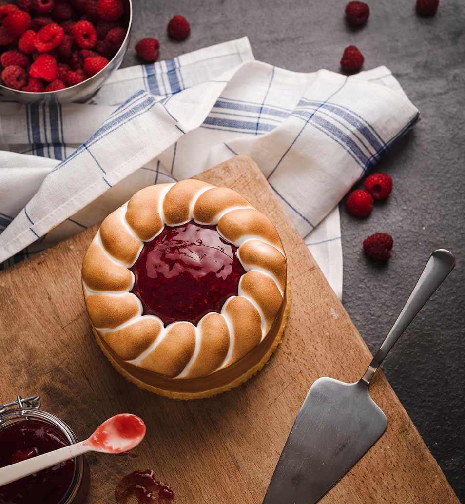 A cake consisting of a fresh quark mousse, on a light biscuit, finished with a raspberry compote and flamed Italian meringue and decorated with pieces of nougat on the edge.